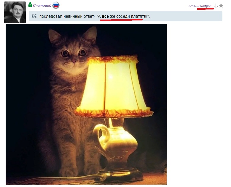 Как мог бы заметить, о том что платит кто-то из соседей сказано исключительно со слов буха. В окончании истории об этом вообще ни слова не сказал. Не сказал, поскольку документального или какого либо еще серьезного подтверждения этого факта не имею.