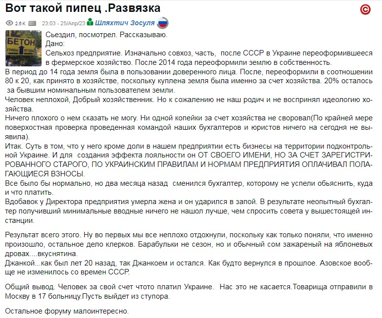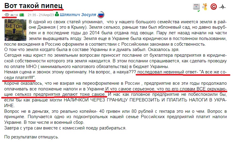 Выясняется, что всё объясняется частными, индивидуальными обстоятельствами директора агрофирмы. Тоже крайне мутными, тоже крайне сомнительными, тоже попахивающими "охренительными историями" (в стиле самого Зосули), но именно индивидуальными. А бухгалтер агрофирмы, ещё неделю назад кричавший в трубку Зосуле "Да тут у нас в северном Крыму не всё так однозначно ВСЕ аграрии так делают, Украине платят!", превращается в недавно назначенного и, по сути, непричастного. Об имеющем политическое значение смелом обобщении из первой заметки и слова нет!