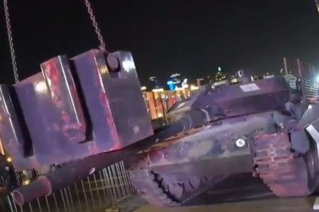В Телеграм-канале военного блогера Кирилла Фёдорова опубликовали видео, как трофейному танку Leopard 2A6, доставленному в Москву, сгибают дуло.