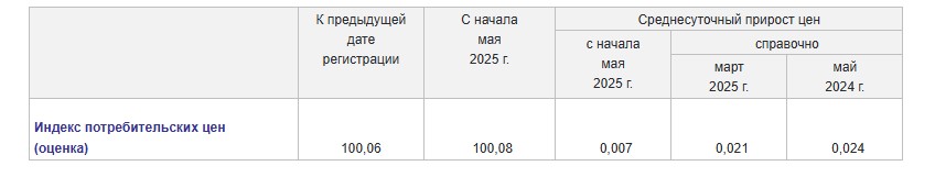 За период с 6 по 12 мая 2025 г. индекс потребительских цен, по оценке Росстата, составил 100,06%, с начала месяца – 100,08%, с начала года – 103,28% (справочно: май 2024 г. – 100,74%, с начала года – 103,22%).