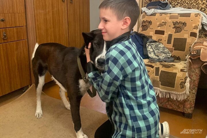 Серёжа Щеглов и собака «Багира», которая лишилась лапы из-за украинской мины. Фото: АиФ/ Никита Сахаров