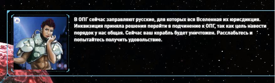 Короче, суть первого брифинга в том, что русский пидор из ОПГ объявляет всю вселенную своей юрисдикцией и угрожает уничтожить ракетой свободных колонистов.