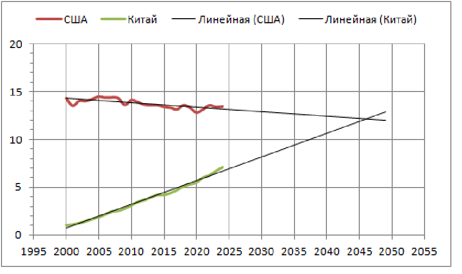 А что будет "завтра", то есть ещё через 25 лет? Догонит ли Китай США к 2050 году? Вот внизу на графике Эксель считает что догонит (линейная экстраполяция посчитана Экселем, я не причём).