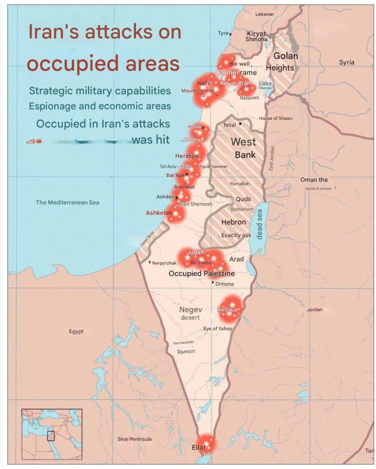 Правда в том, что «Израиль» на самом деле потерпел сокрушительное поражение в том, что Трамп называет 12-дневной войной, с огромным количеством задокументированных разрушений и ещё большим военным ущербом, скрытым цензурой. Впервые в истории «Израиля», который привык бить всех подряд, он потерпел поражение. Это карта, которую опубликовал Иран, и они смогли нанести удары по «Израилю» повсюду, в том числе по военному командованию прямо в центре Тель-Авива.
