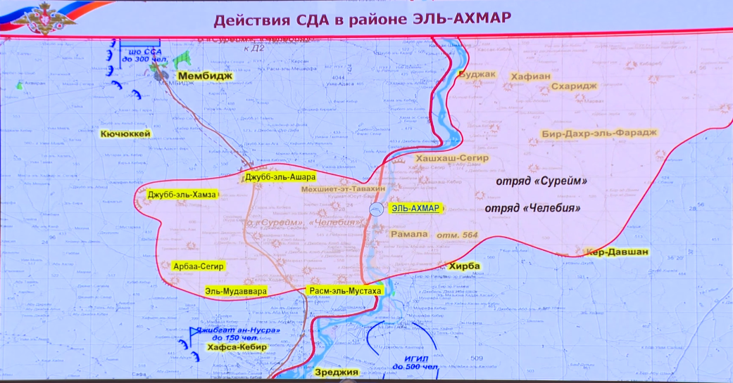 Отряды «Сурейн» и «Челобия» расширили освобожденные от экстремистов территории с восточной и западной стороны плотины через реку Евфрат в районах МЕХШИЕТ-ЭТ-ТАВАХИН, ДЖУББ-ЭЛЬ-ХАМЗА, АРБАА-СЕГИР, ЭЛЬ-ДЖУДАЙДА, ЭЛЬ-АХМАР.