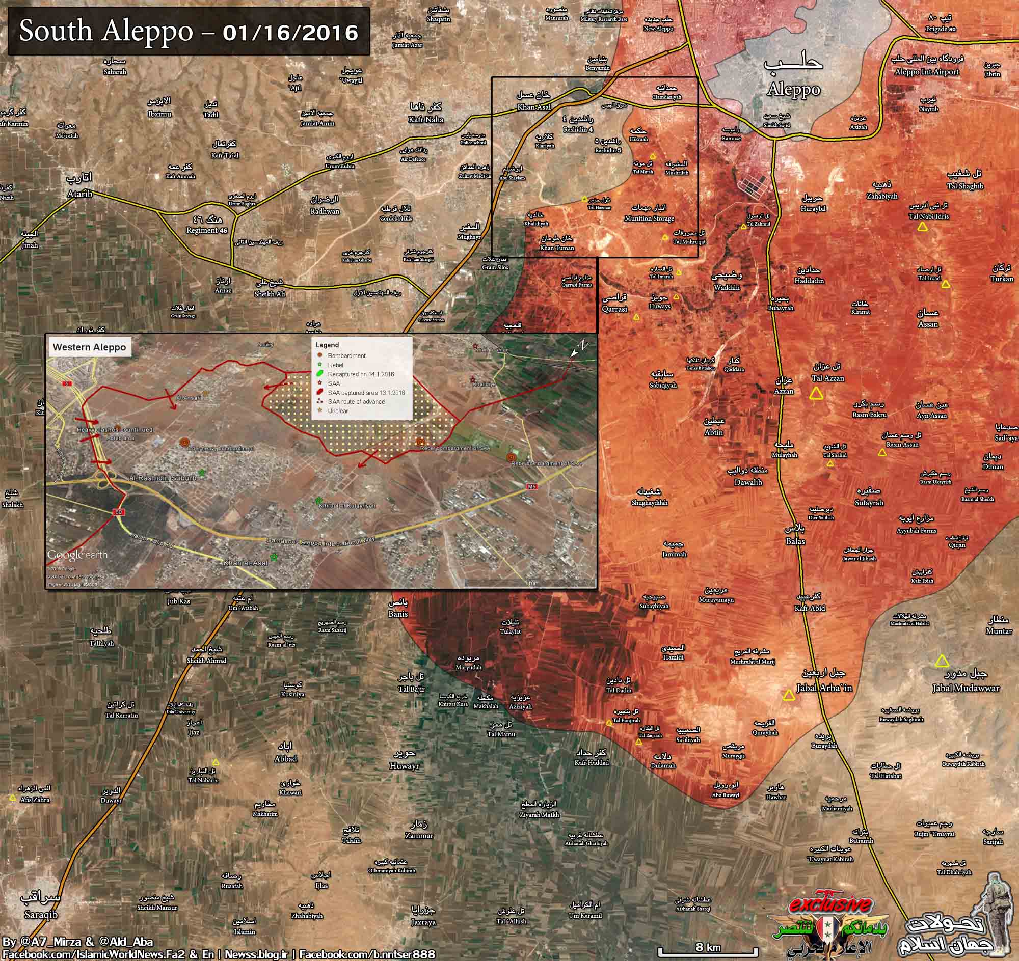 В четверг утром в южном Алеппо, исламистские боевики Джабхат Аль-Нусра (Сирийская Аль-Каида группа), Харакат Ахрара Аль-Шам и Харакат Нуруддин Аль-Зинки проснулись, чтобы увидеть себя в окружении в Al-Rashiddeen, а 4-я механизированная дивизия Сирийской Арабской армии и их союзники начали массированное наступление на северном и южном флангах этого стратегического города.