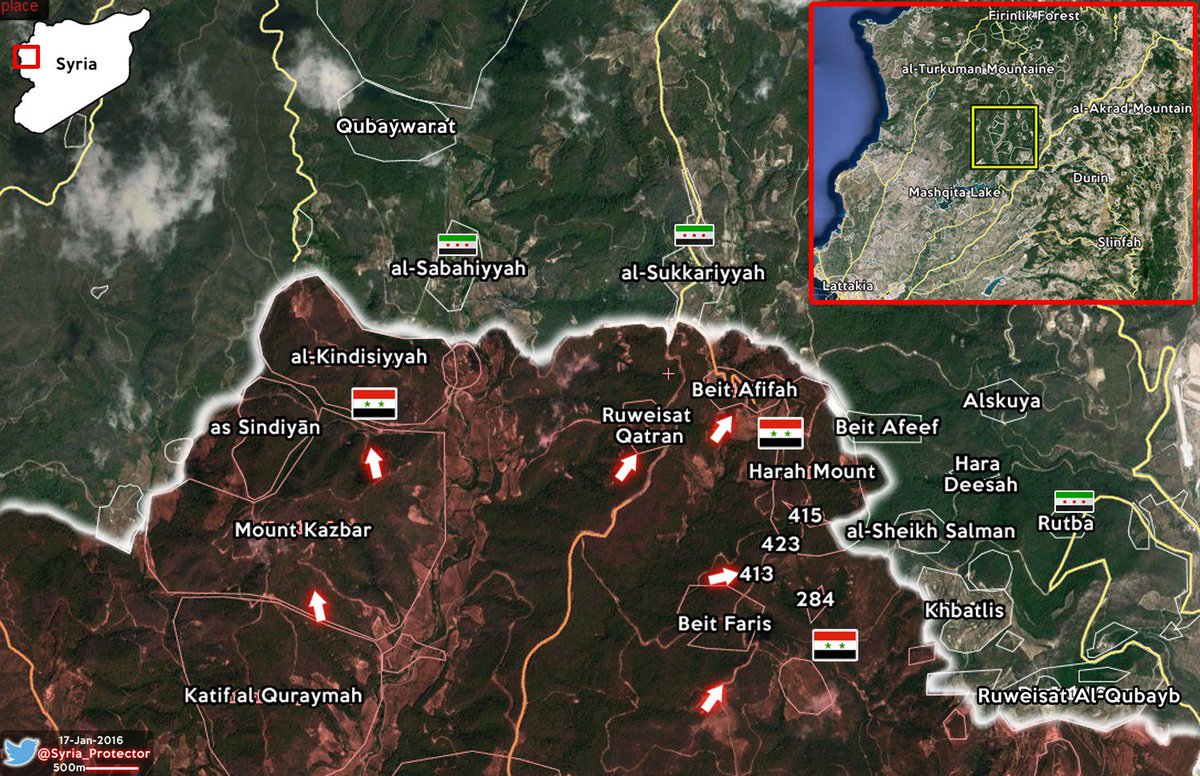 По последним сообщениям из Латакии, 103-я бригада Сирийской Арабской армии и их союзники заняли Jabal Kazbar и Jabal Al-Sindiyan в Туркменских горах, убив несколько вражеских комбатантов в процессе этого.