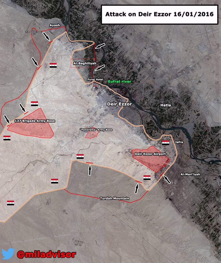 Город Дейр-эз-Зор был полностью осажден в конце 2014 года Тем не менее, правительственные войска 104 воздушно-десантной бригады Республиканской гвардии Сирийской Арабской армии все еще сохраняют контроль над 50% города. Если ИГИЛ захватит город Дейр-эз-Зор полностью, это позволит им высвободить столь необходимые войска на фронта Алеппо, которые в значительной степени рушатся возле Аль-Баба и Manbij.