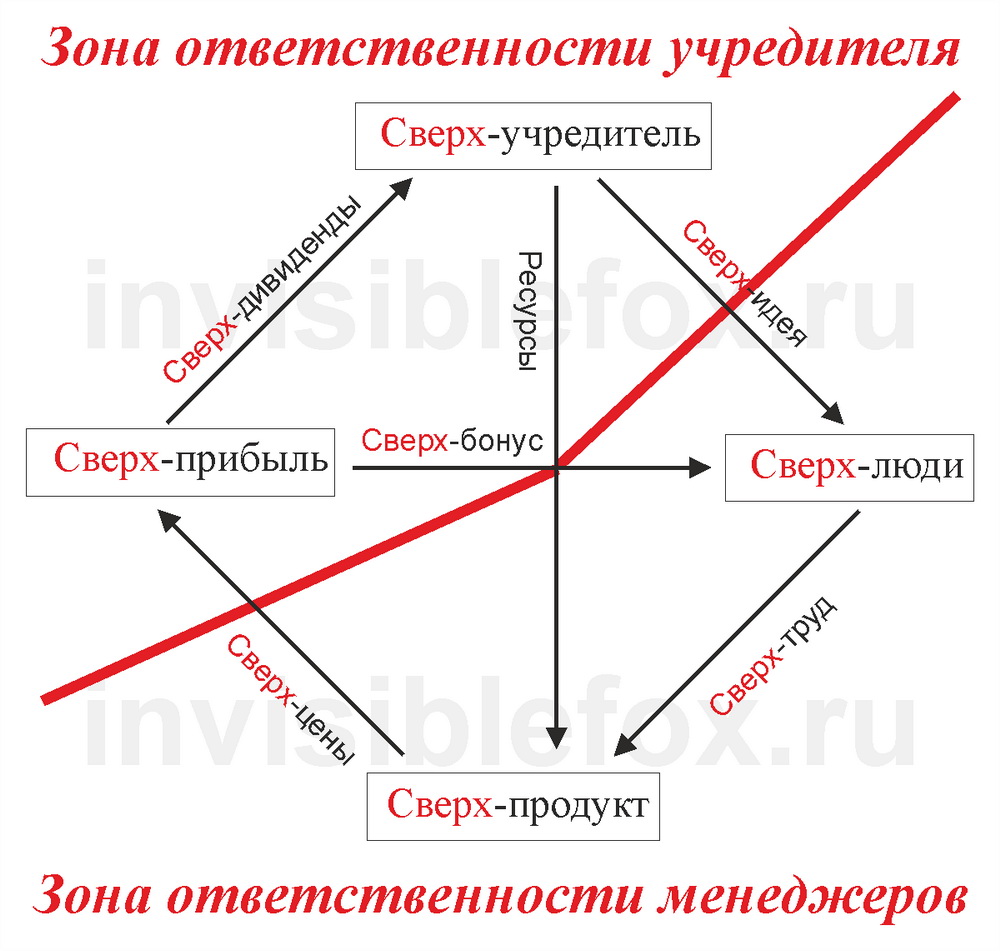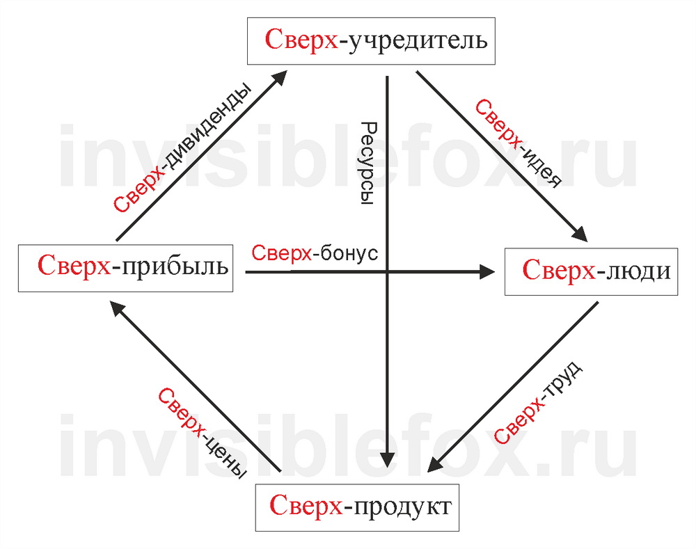 - помимо сверхбонуса сверхучредитель определяет также размер ресурсов, расходуемых на расширение и качественное развитие бизнеса. Стоит им сократиться, как сверхпродукт и сверхприбыль начнут постепенно утрачивать качество «сверх-».