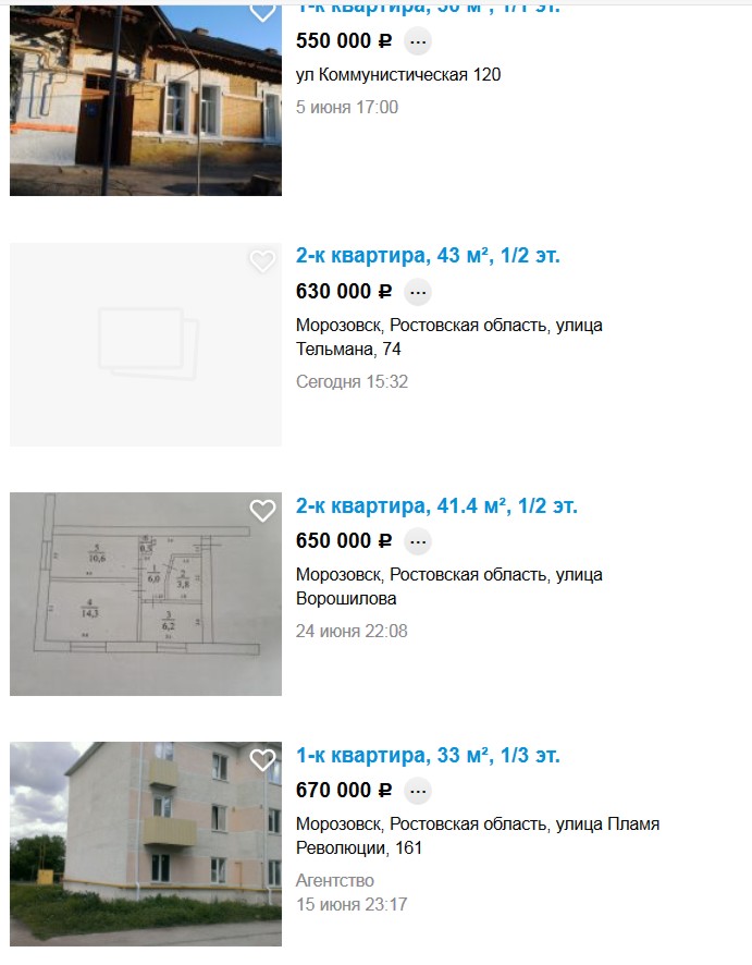 Районный центр в теплой Ростовской области. Средняя температура по году +8,6 градусов, население 25 467 человек, из промышленности сельхозтехника (АО Клевер, бывший Морозовсксельмаш), сельхозпереработка, локомотивное депо. Плюс военный аэродром. Стоимость квартир отличается несильно: