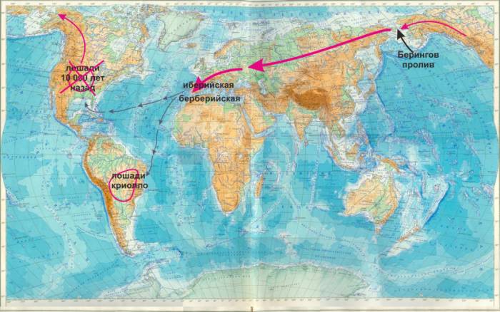 2. По "официальной" гипотезе лошади тоже сформировались как вид в Северной Америке, но попали в Евразию во время очередного образования сухопутного "моста" через Берингов пролив примерно 10 тысяч лет назад. Мост образовывался по разным оценкам 4-6 раз, через него проникали слоны, носороги и прочая живность, но лошади дисциплинированно ждали своего часа и проникли в Евразию в последний момент через Аляску, Чукотку и Сибирь!