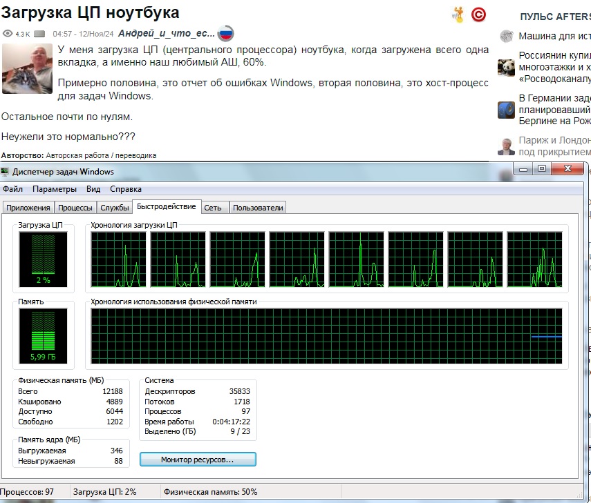 У меня загрузка ЦП (центрального процессора) ноутбука, когда загружена всего одна вкладка, а именно наш любимый АШ, 60%.
