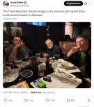 Там написано: The Three Bandidos: Steven Seagal, Larry Johnson and myself at an undisclosed location in Moscow! Три бандита: Стивен Сигал, Ларри Джонсон и я - в неизвестном месте в Москве!