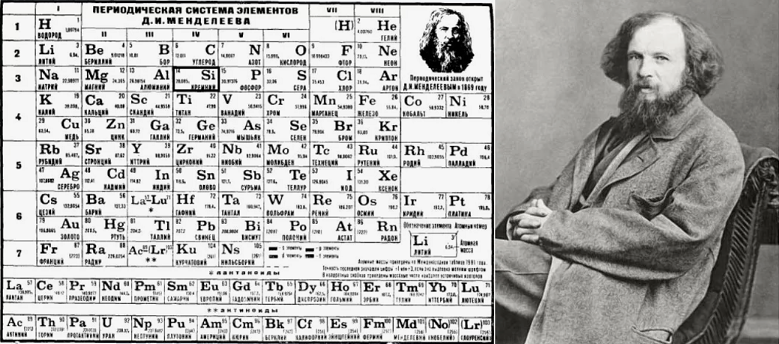 Рисунок №5. Периодический закон - это фундаментальный закон, который был сформулирован Менделеевым в 1869 году: "Свойства элементов, формы и свойства образуемых ими соединений находятся в периодической зависимости от величины их атомной массы". Современная формулировка имеет уточнение: "Свойства химических элементов и их соединений находятся в периодической зависимости от величины заряда атомных ядер". Фотопортрет Менделеева справа выполнил в 1861 году придворный фотограф Левицкий Сергей Львович. Факт: свою таблицу Менделеев увидел во сне, в которой все элементы находились на своих местах, проснувшись, он записал ее на листке бумаги.
