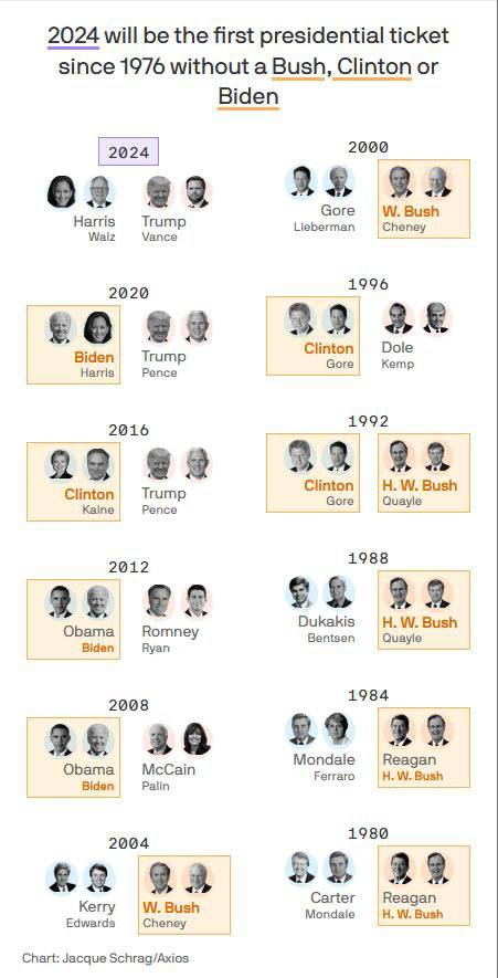 Графика к тезису о том, что сегодняшние выборы в США — первые с 1976 года, на которых нет Бушей, Клинтонов или Байденов