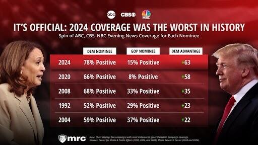 Media Research Center сообщает, что освещение выборов в прессе ещё никогда не было настолько однобоким: лишь в 15% репортажей о команде Трампа рассказывалось в положительном ключе, по сравнению с 78% для команды Харрис.