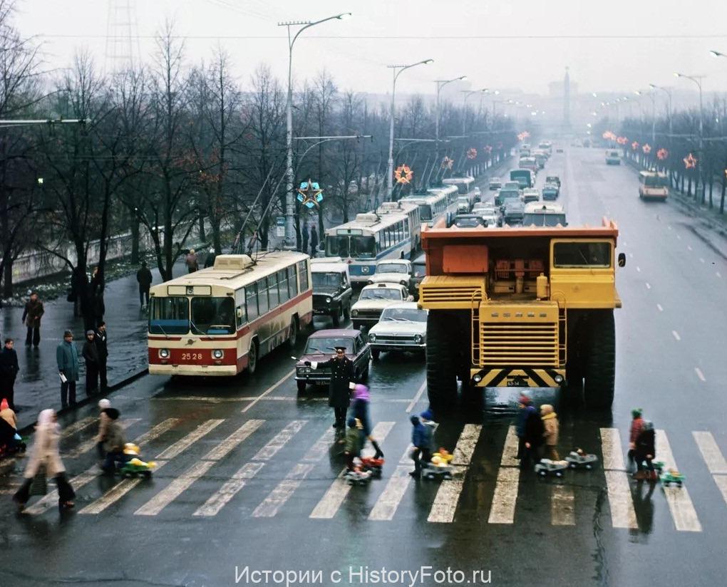 Но ведь это центр города, что в нём делать огромному самосвалу, предназначенному для карьерных работ? Разумеется, нечего. Кадр этот постановочный от начала и до конца. Фотография должна была демонстрировать и невиданную в мире мощь советской промышленности, и неусыпную заботу о будущем страны, и преемственность поколений, которые наигравшись в раннем детстве игрушечными самосвалами и насладившись любовью и попечением советского педагогики и советской милиции, непременно создадут, когда вырастут, нечто еще более глобальное, чем грандиозный БелАЗ.