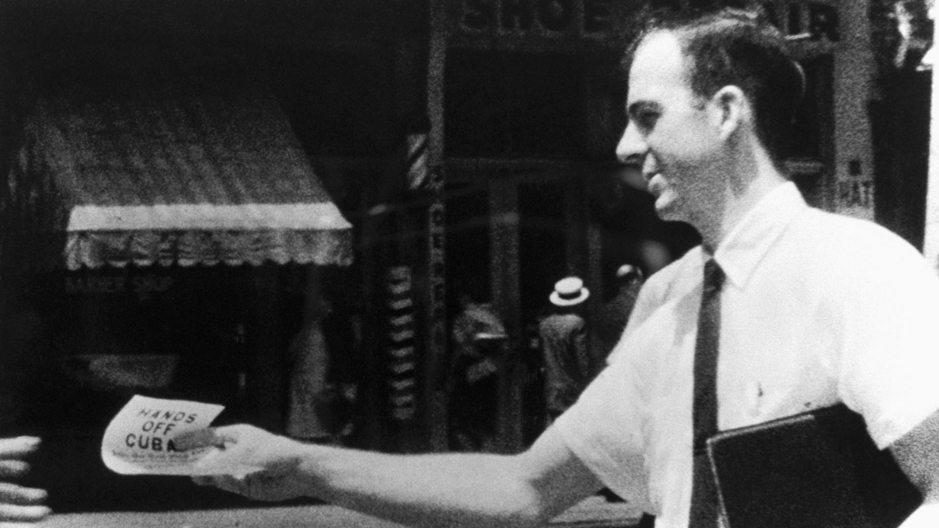 Ли Харви Освальд распространяет листовки «Руки прочь от Кубы» в Новом Орлеане. Эта фотография использовалась при расследовании убийства Кеннеди. В недавно опубликованном документе ЦРУ говорится, что агент проводил операцию, в ходе которой он вступил в контакт с Освальдом до того, как его обвинили в убийстве президента Кеннеди в 1963 году.