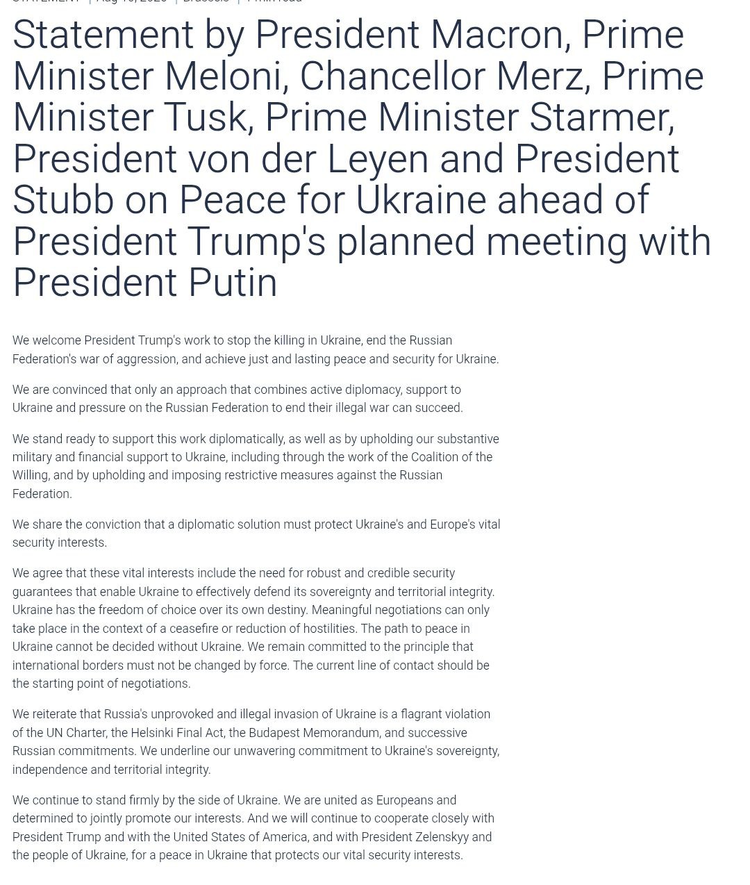 Заявление президента Макрона, премьер-министра Мелони, канцлера Мерц, премьер-министра Туска, премьер-министра Штармера, президента фон дер Ляйен и президента Стубба о мире для Украины в преддверии запланированной встречи президента Трампа с президентом Путиным.