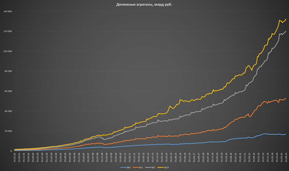 В начале дается краткая теория по денежным агрегатам: М0, М1, М2, М2Х. Ну чтобы незнакомым с предметом стало всё понятно. А далее работаем с графиками общих показателей и различных приращений. Месячных, годовых и за 25 лет.