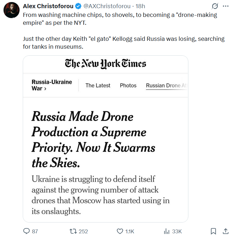 В ответ на заголовки неполживого издания «Времена Нью-Йорка» «Россия сделала производство дронов своим главным приоритетом. Теперь они заполонили небо», люди интересуются, не из стиралок ли эти чипы, что сделали Россию дроновой империей?