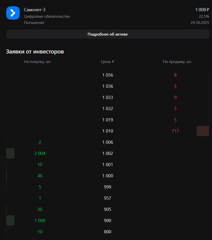 Собственно, что есть вторичный рынок? Рынок, на котором активы продают уже на сами Эмитенты, а Инвесторы, которые эти активы у Эмитента приобрели при первичном размещении. На картинке вторичный рынок цифрового обязательства Группы Самолёт. Площадка – Альфа-Банк.