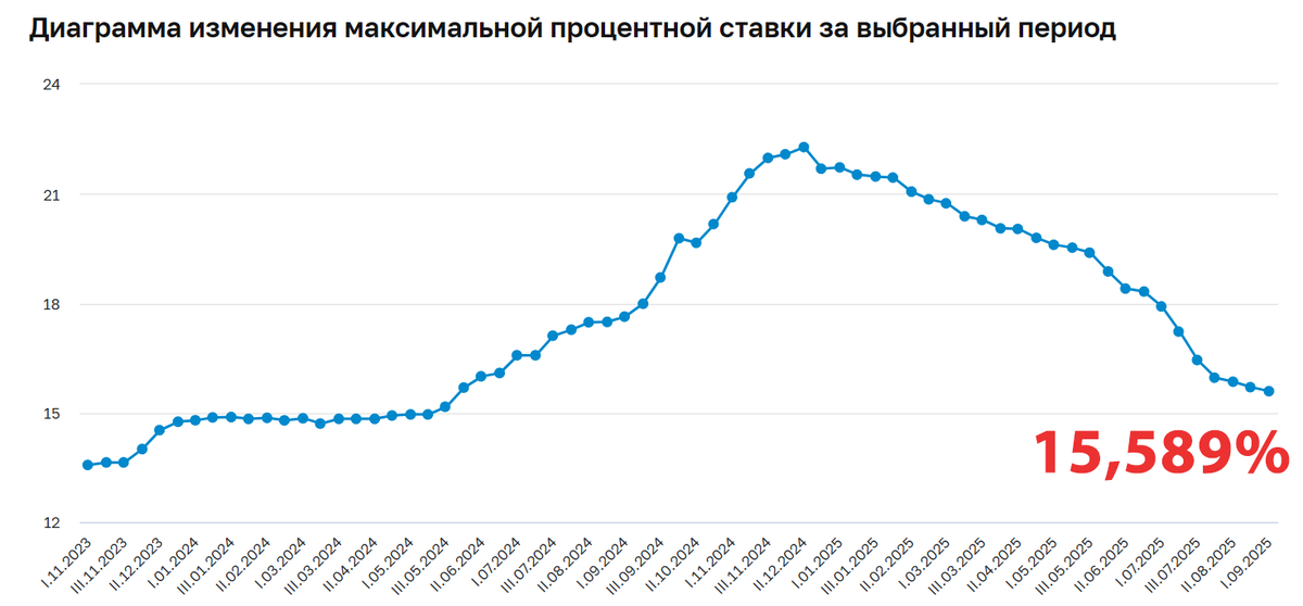 Именно столько составила максимальная процентная ставка по вкладам десяти кредитных организаций, привлекающих наибольший объём депозитов физических лиц по итогам 1 декады сентября.