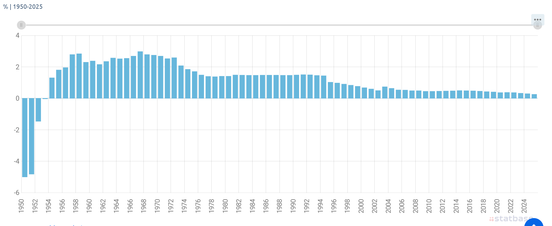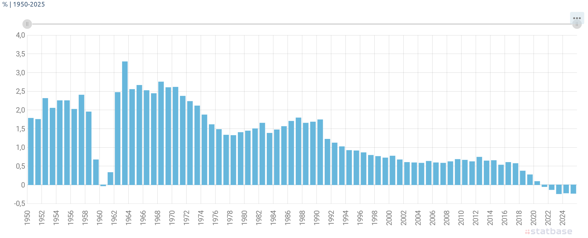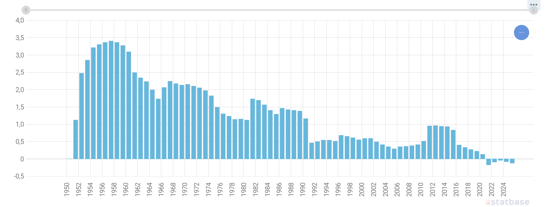Если привести к одному масштабу, то очевидно, что темпы прироста у них были одинаковы, только база разная, что и сказалось на абсолютных значениях. Если не считать еще и потери от корейской войны. Но вот будущее у них рисуется разным. Хотя попытка Ким Чен Ына внедрить некоторые капиталистические элементы все же сказывается, но прирост сохраняется, в то время как ЮК весело начинает вымирать. Формирование глобальной капиталистической истемы сказалось и там, и там. Пики прироста в ЮК точно совпадают с завозом мигрантов. В последний пик завезли почти 2 млн. Не помогло.