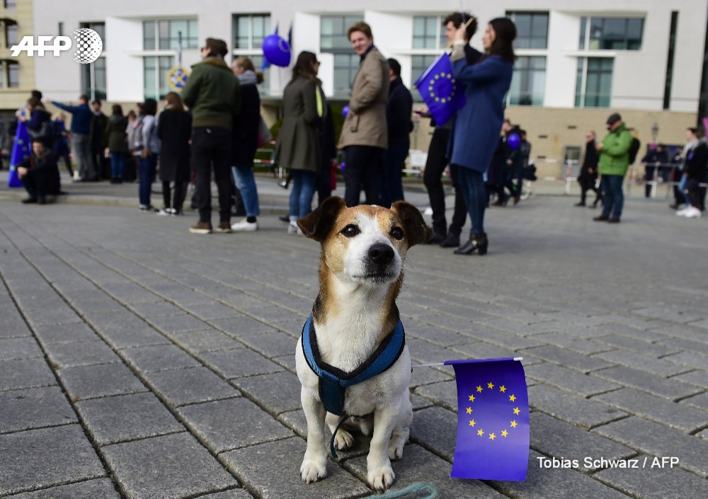 (собачка держит флаг ЕС на торжествах по случаю 60-летия Римского договора, Берлин, фото AFP)