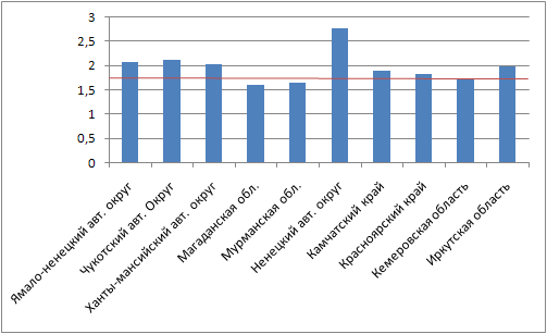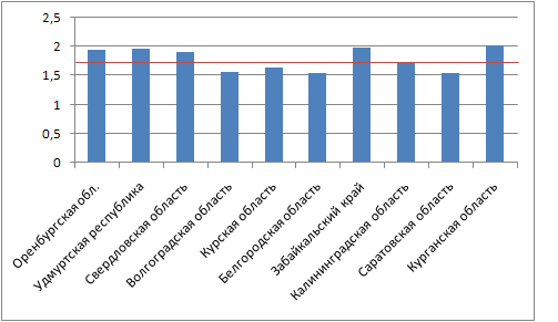 Красной линией обозначен средний коэффициент по России, равный 1,71.