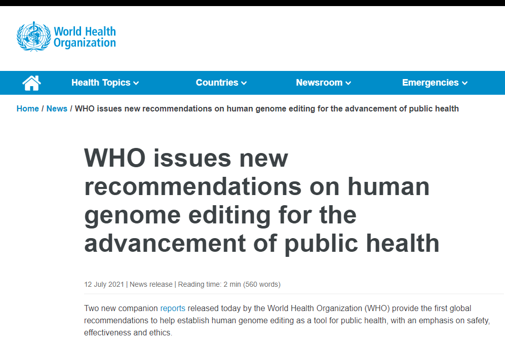 (1) https://www.who.int/news/item/12-07-2021-who-issues-new-recommendations-on-human-genome-editing-for-the-advancement-of-public-health