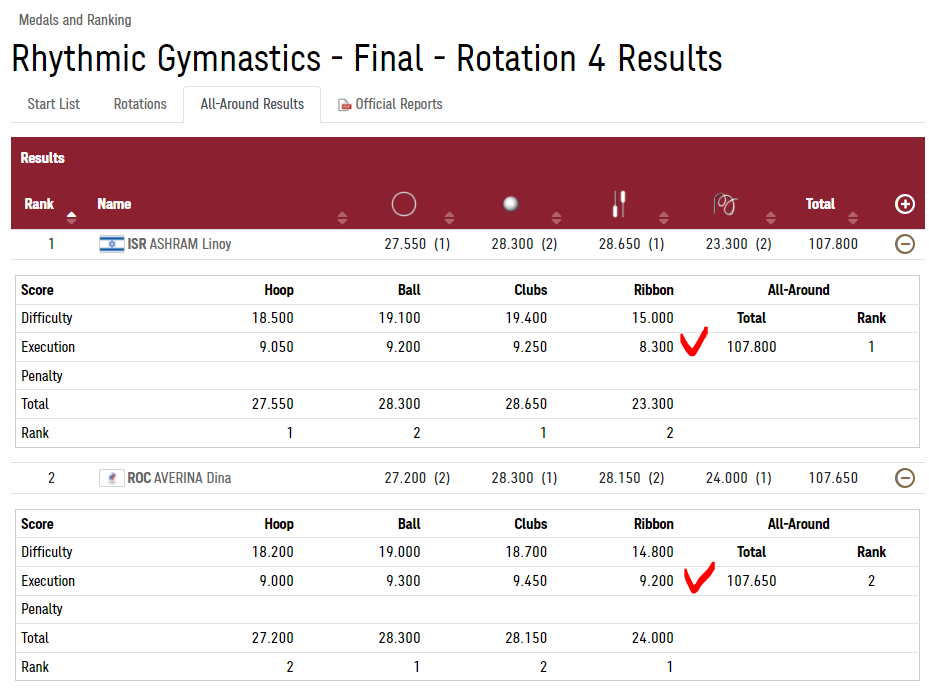 2. Вот олимпийский протокол оценок Ашрой\Авериной и обратите внимание, что у Ашрой НЕТ штрафа за потерю ленты.