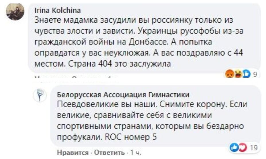 4. Последнее::: я сегодня поняла, почему иммигрантам 1-2 поколения в других странах не позволяют занимать положение в обществе страны выше прислуги - вот это явно писала хохлядь, недавно приехавшая из Украины и она даже не сомневаясь своей писаниной подставила федерацию Белоруссии, когда писала с официального аккаунта федерации художественной гимнастики Белоруссии.
