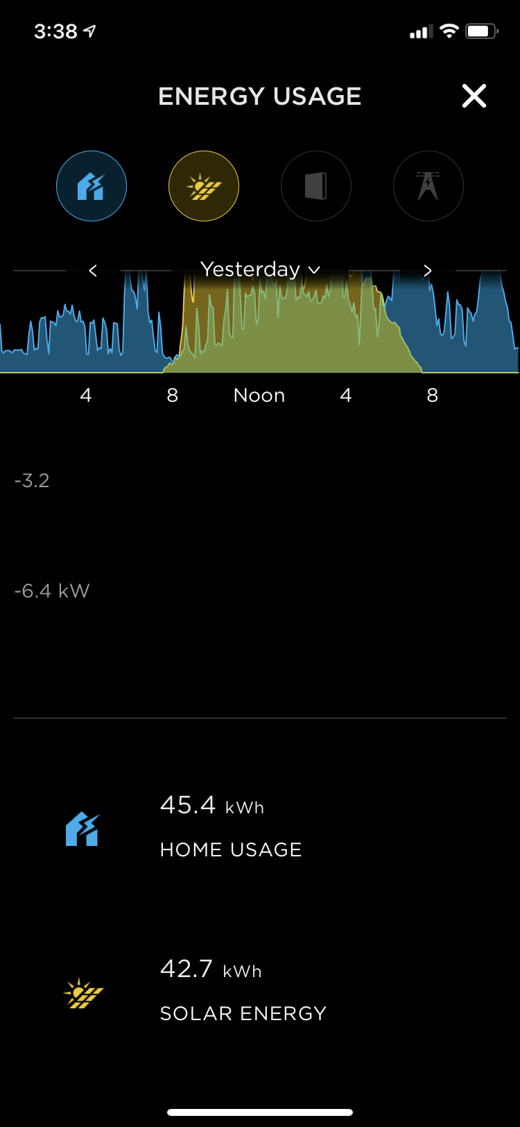 Вчера потребление было 45квтч (синее) Солнечная генерация 42квтч (желтое,было облачно весь день)