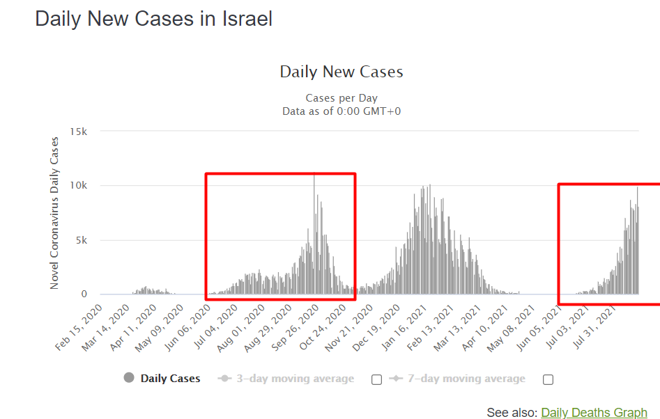 У сторонников всеобщей принудительной вакцинации, не так давно был прекрасный пример для подражания. Израиль, мол, проколол население и там всё закончилось. Никто не болеет, и не умирает.