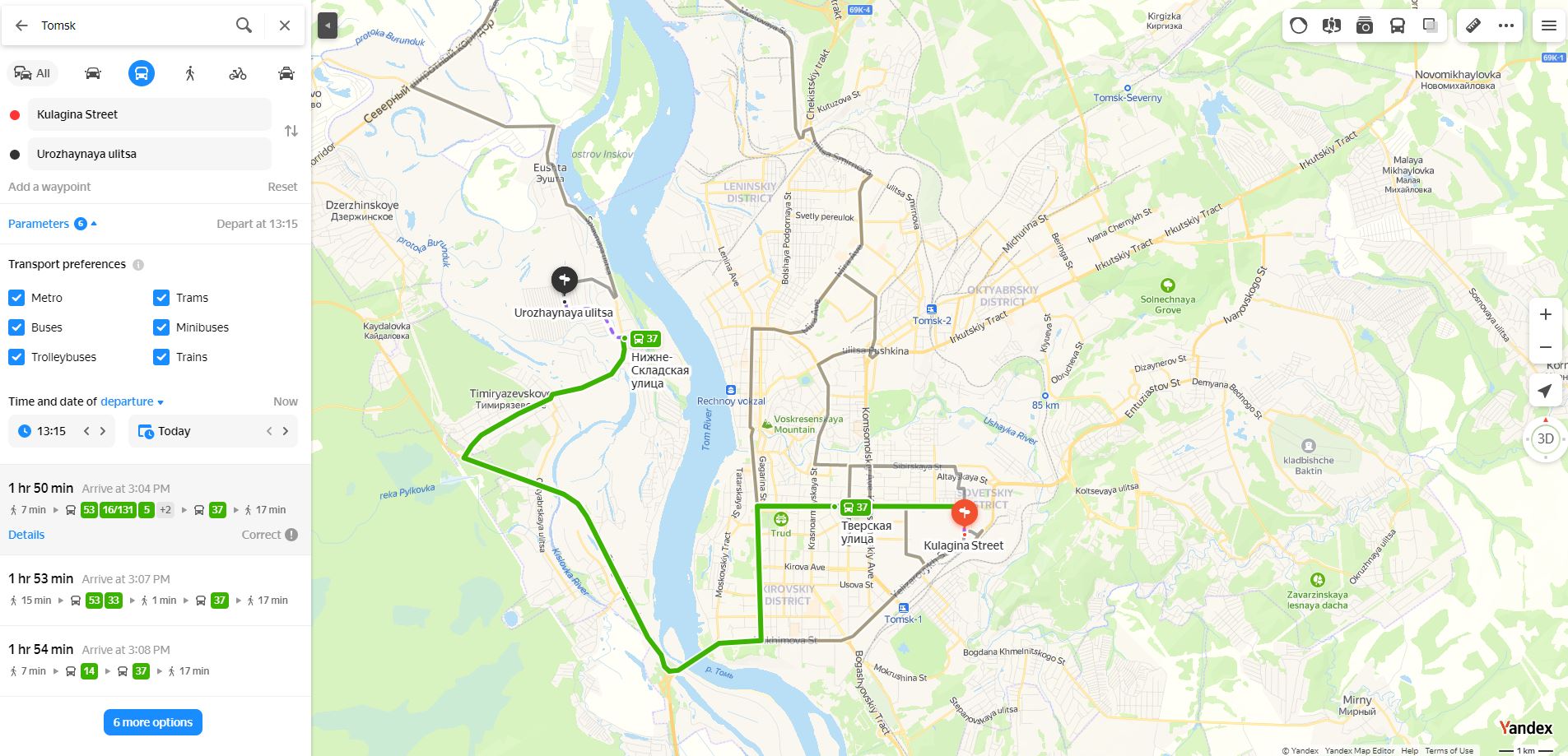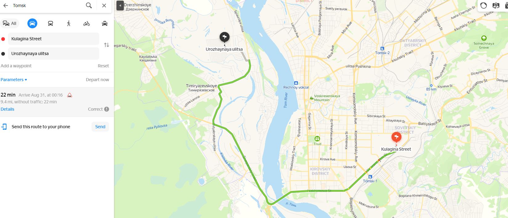 Берем город Томск. Тыкаев в две произвольные точки на карте (в черте города), и смотрим. На машине 22 минуты, на общественном транспорте 1 час 50 минут (из них 30 минут пешком). И это только в определенные часы когда общественный транспорт ходит.