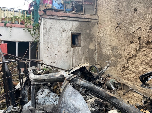 Афганские жители и члены семей погибших собираются рядом с поврежденным автомобилем в доме через день после авиаудара американского беспилотника в Кабуле 30 августа.