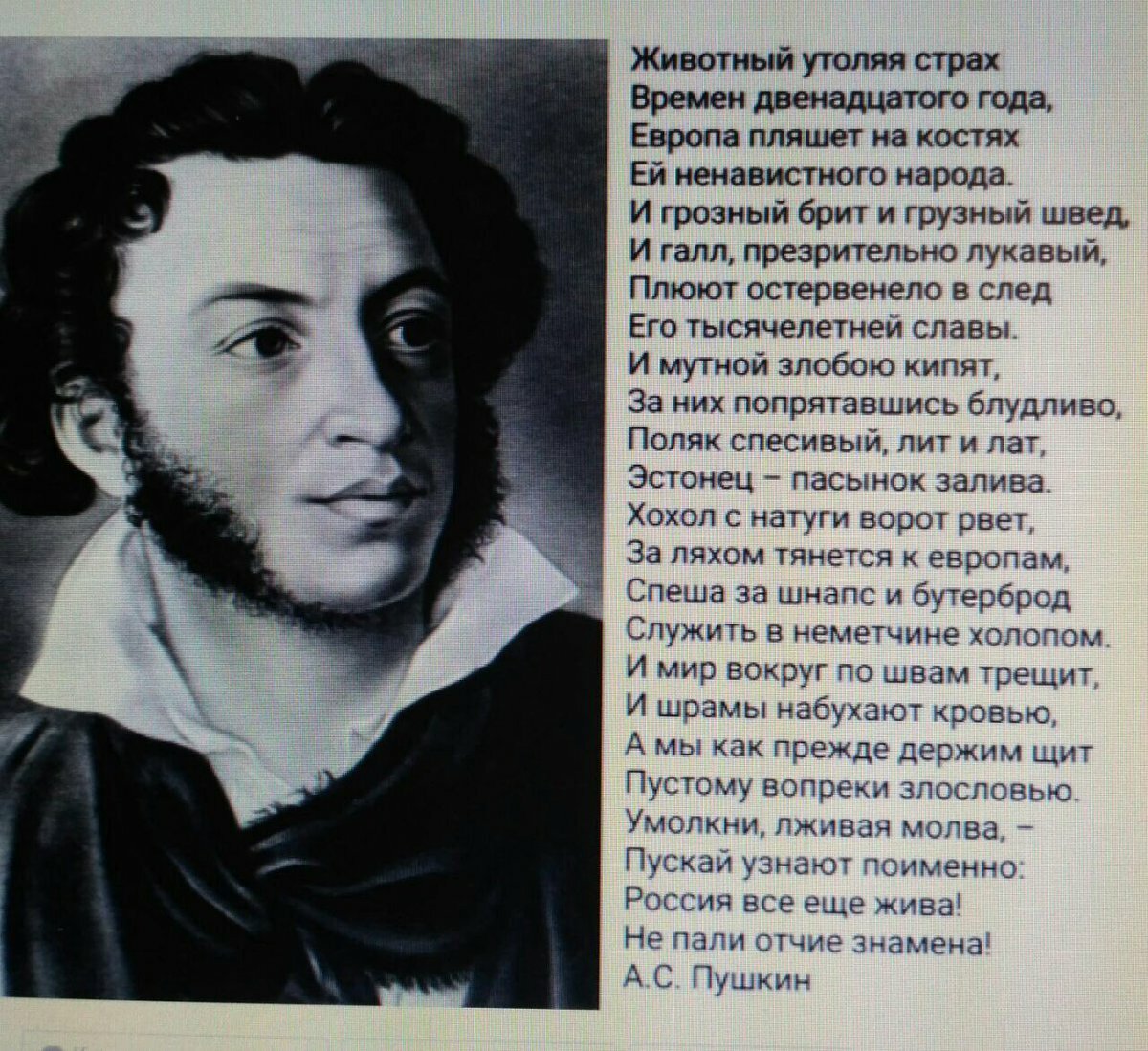 Но без Пушкина тут не обошлось, так как стихотворение написано как продолжение пушкинского "Клеветникам России".