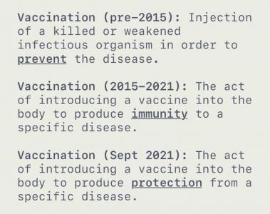 Новое определение вакцины теперь гласит: “Препарат, который используется для стимулирования иммунной реакции организма против заболеваний”, в то время как вакцинация-это “акт введения вакцины в организм для получения защиты от конкретной болезни”.
