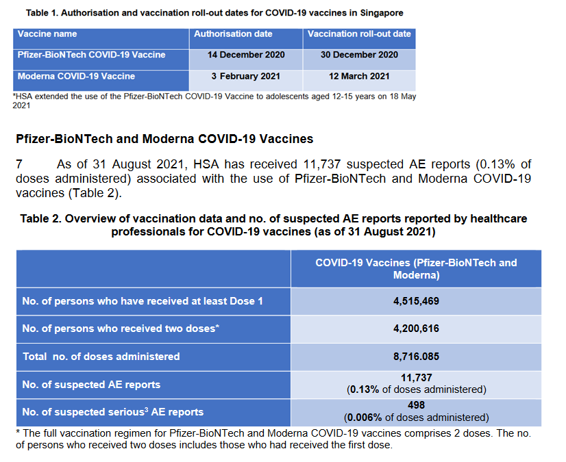 Последний отчет о вакцинации в Сингапуре вышел 16 сентября (исследования с 30 декабря 2020 – 31 августа 2021). В отчете приводятся данные