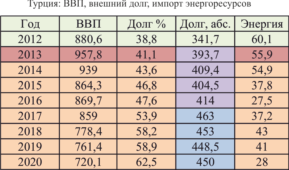 2013 г. – максимум ВВП Турции (Таблица). Долг вырос на $52 млрд, а ВВП на $77,2 млрд. С 2014 г. началось снижение ВВП. Выделяется два периода стабилизации долга: 2014-2016 гг. и 2017-2020 гг. В 2016 г. произошёл небольшой рост ВВП на фоне минимальных затрат на импорт энергоресурсов. В 2017 г. – небольшой спад при резком росте долга – на $49 млрд. Возможно это как-то связано со снижением курса лиры (периодом неустойчивости турецкой валюты). В 2018-2020 гг. долг не рос, ВВП снижался.