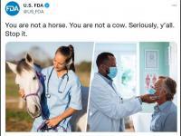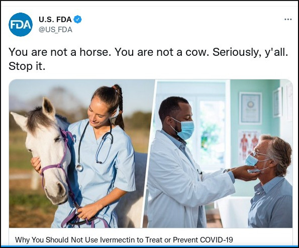 Ныне ивермектин очень настойчиво изображают в прессе как лекарство для лошадей и рогатого скота, всячески предупреждая читателей от мыслей о принятии препарата. «Вы не лошадь. Вы не корова.» – говорит один из новых плакатов FDA, массово распространённый через Твиттер. И добавляет: «Серьёзно, вы все, прекратите это делать. Нельзя применять ивермектин для предотвращения или лечения COVID-19»…