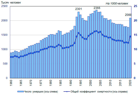 стюардессуЭцилопа. Свежие данные посмотрите, сильно вниз и заболеваемость и смертность. Смертность 7 случаев в день. В пересчёте на население России это 110-120 случаев. Считай на порядок меньше чем в России. А вы пишите, пишите.Рисунок 1. Число умерших (тысяч человек) и общий коэффициент смертности (на 1000 человек постоянного населения) в Российской Федерации, 1960-2020* годы