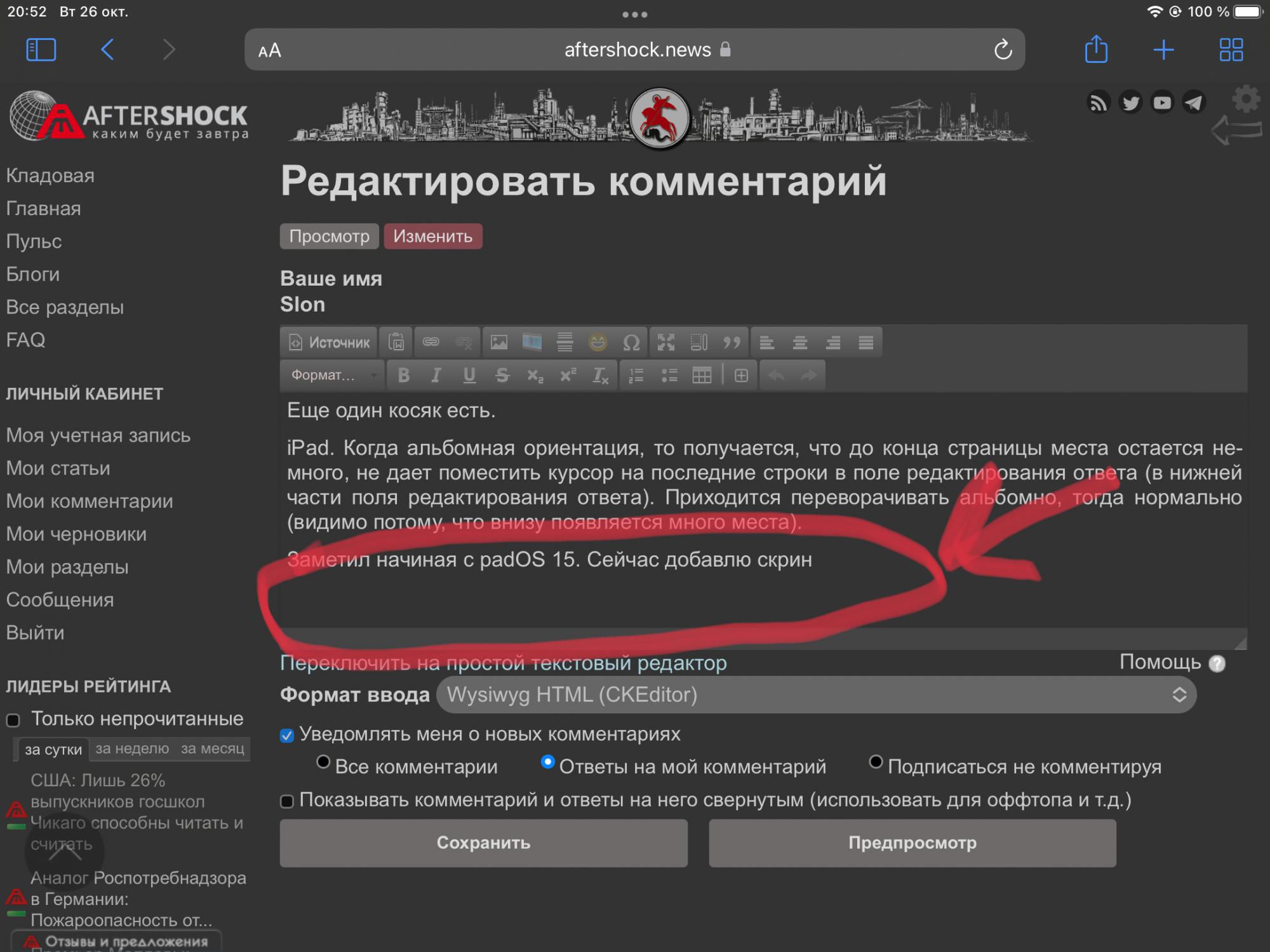 iPad. Когда альбомная ориентация, то получается, что до конца страницы места остается немного, не дает поместить курсор на последние строки в поле редактирования ответа (в нижней части поля редактирования ответа). Приходится переворачивать альбомно, тогда нормально (видимо потому, что внизу появляется много места).