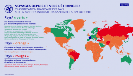 (...) "Такая классификация стран мира действует с 9 июня и зависит от уровня циркуляции вируса и наличия вариантов. Она варьируется от "зеленой зоны" (самый благоприятный уровень) до "красной зоны" (самый неблагоприятный уровень) - большинство стран классифицируются как "оранжевая зона". Но что это на самом деле меняет? Каждый цвет соответствует уровню ограничений на выезд и возвращение, который зависит от того, вакцинирован человек или нет. Подобные рамки интерпретации изменились для вакцинированных путешественников, которые теперь могут ездить во все страны, независимо от цвета их зоны, без обоснования уважительных причин. Таким образом, на них данная карта больше не оказывает реального влияния. Список стран, которые там фигурируют, продолжает меняться в зависимости от санитарной ситуации на местах", - отмечает автор статьи.