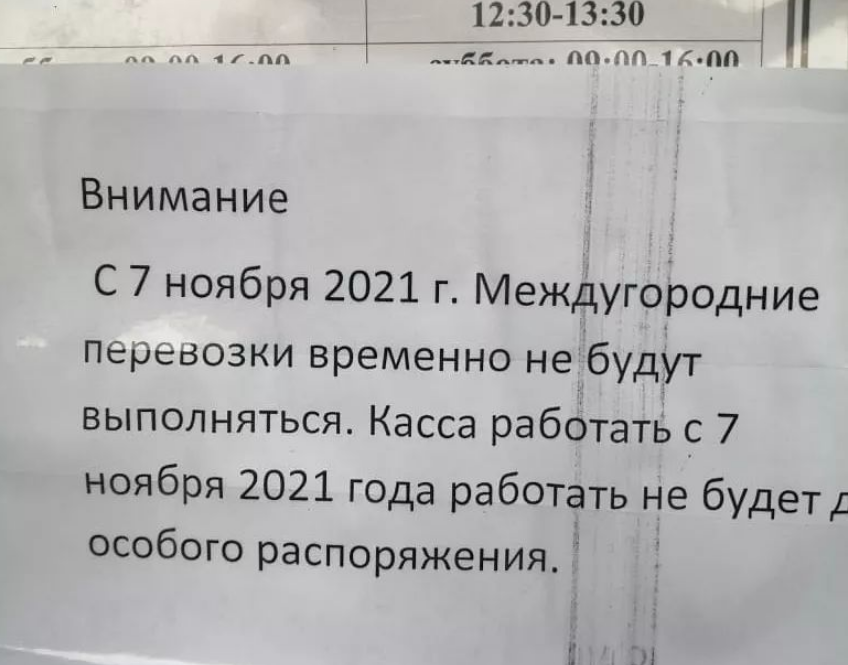 - С 7 ноября 2021 года междугородние перевозки временно не будут выполняться. Касса работать не будет до особого распоряжения, - говорится в объявлении.