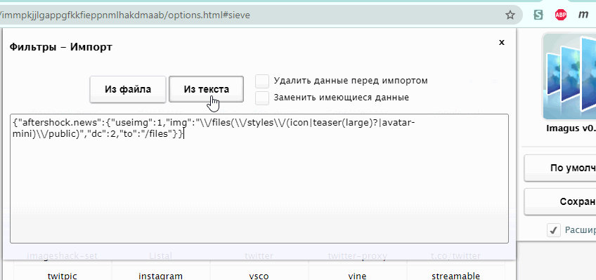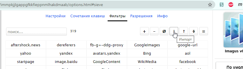 - В "Фильтрах" нажимаем кнопку "Импорт", чтобы затем ввести фильтр для aftershock.news. Он у меня уже стоит, поэтому результат вставки будет выглядеть, как на скриншоте - первая кнопка -"aftershock.news".