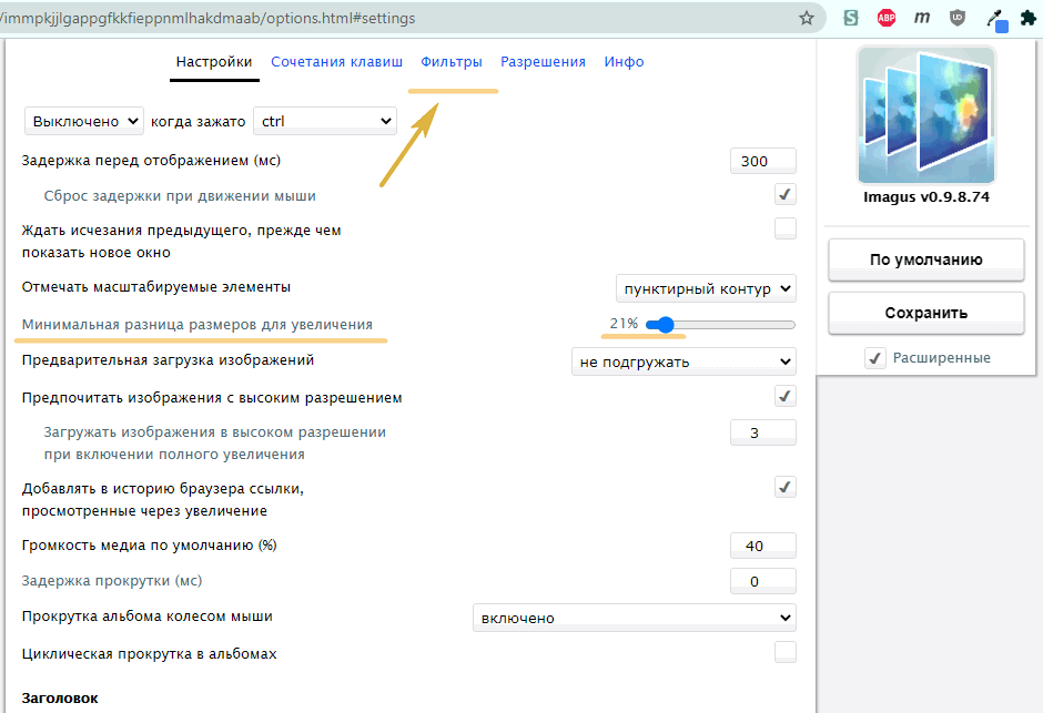 - Находим, где у Хрома - значок расширения Imagus. ... Да, настройки - там, за вертикальным троеточием, указанным стрелкой мыши.