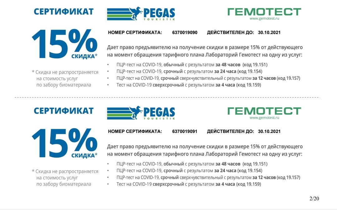 Для путешественников. По поводу ПЦР. Если едете семьей/толпой, то при покупке чего-либо через "Пегас" поощряют скидкой на исследования в вышеупомянутом "Гемотесте" (пы.сы. в октябре так было/ Спб). Такие: