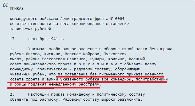 Ну а во второй части разбора я показал вполне скан не мифического, а вполне реального документа. Хранящегося в архиве Министерства Обороны. Приказ Жукова изданный как раз в том сентябре 1941 года. В котором действительно говорится о жёстком наказании за оставление позиций, но лишь самих бойцов-нарушителей (а не их семей!)